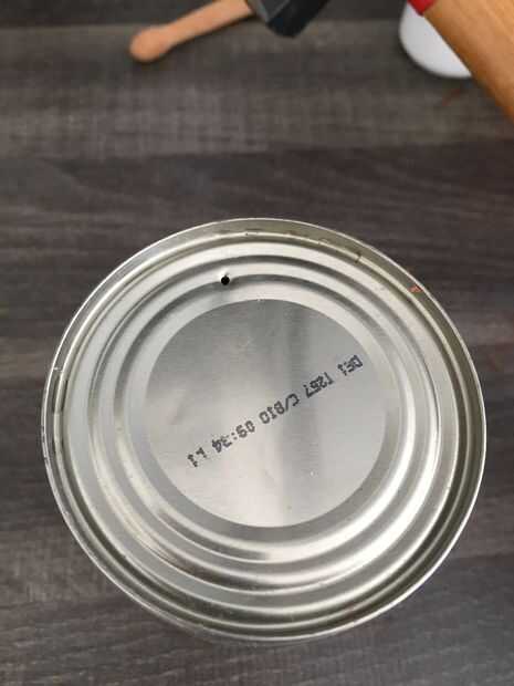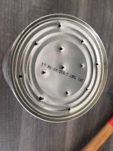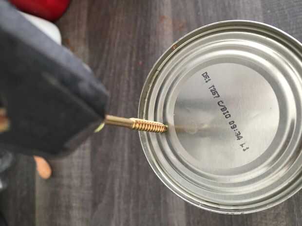 Voltear la lata boca abajo, sobre una superficie dura. Tomar el tornillo, colocarlo donde tu quiere su agujero y golpeó con cuidadosamente con el martillo. No hay necesidad de mucha fuerza, los agujeros deben ser algo pequeños para que el suelo no se caiga a través de ellos.