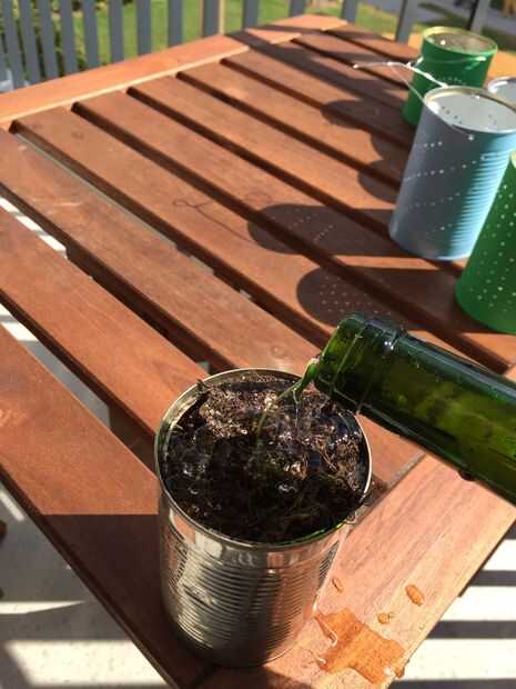 Su planta para compactar la tierra del agua. Puede que necesite añadir algunos más suelo luego. Tenga cuidado, usted podría tener agua sucia escaparse hacia fuera la parte inferior, por lo que no lo hacen en su mesa de comedor de $$$.
