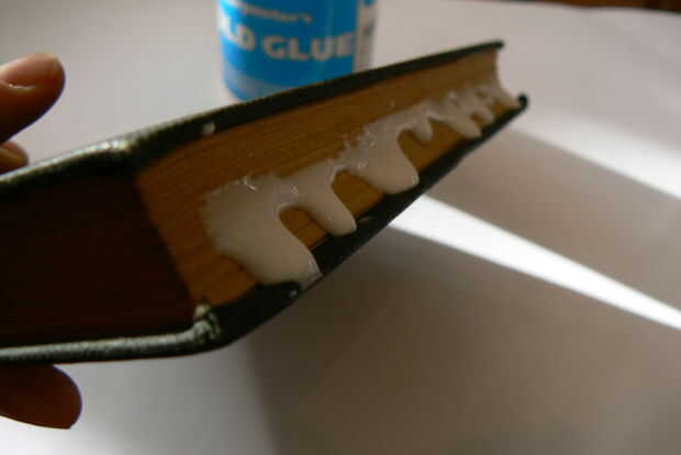 Untar una capa de pegamento para madera a lo largo de los bordes de cada libro que va a corte abierto, para garantizar las páginas en el lugar. Si usted planea apilables dos libros, pegarlos juntos sin poner pegamento en el área que se va a cortar, ya que esto hará más difícil de cortar a través.