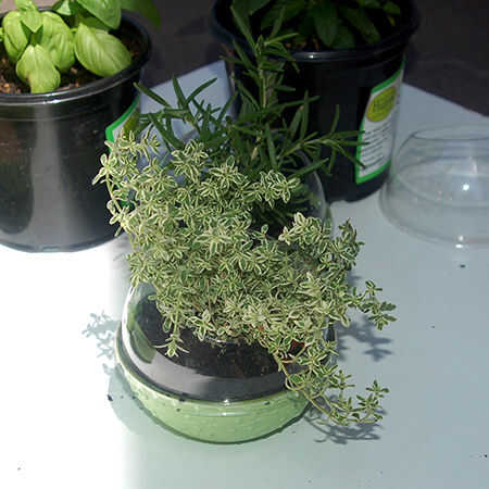 Cuidadosamente sus hierbas pequeñas encima de la grava del trasplante y llenar el suelo al nivel de la base. Ahora puedes pop en la parte superior y tire suavemente la planta a través del orificio en el contenedor.