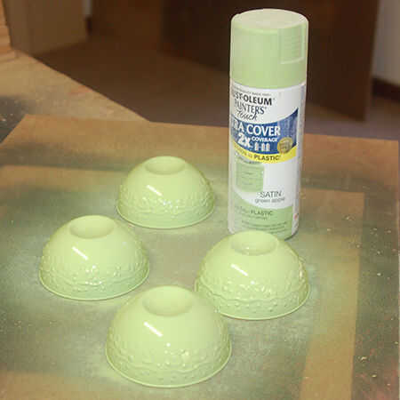 Deje que la pintura seca antes de rociar con pintura en aerosol Rust-Oleum 2 X en su elección de color. He usado verde satinado se aplica sobre la base de los envases de plástico. Usted encontrará los productos de la gama completa de Rust-Oleum en sus constructores locales.