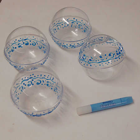 Los envases de plástico se presionan con marca en la parte posterior, si desea cubrir este-use una pluma Bostik GlassDeco (pintura puffy) para pintar un diseño que cubre hasta el logotipo de la empresa. Estas plumas dejan un diseño elevado que cubre muchos pecados!