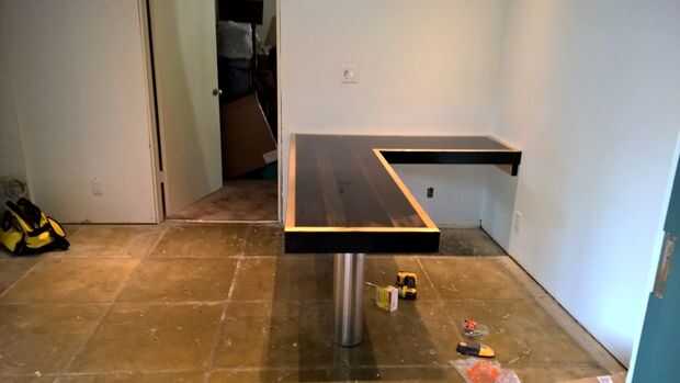 Así, que sería construir un armazón de madera contrachapada y 2x4s, conseguir algo de madera reciclada, cubrir todo en epoxy (inspirado en Jordania Porritt como se mencionó anteriormente), encontrar una manera para montar la cosa en la pared y apoyarlo sólo con una pierna de metal grande (yo la odio si no puedo moverse sin chocar con mis piernas en las patas).