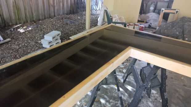Luego poner el escritorio en el suelo encima de las hojas y utiliza pequeñas cuñas de madera para asegurar fue perfectamente nivelada ya que mi piso no es. Luego añadí cinta del pintor azul alrededor de los bordes como una barrera que el epoxi construir un borde afilado.