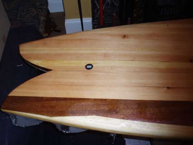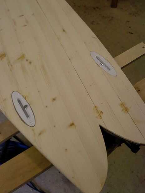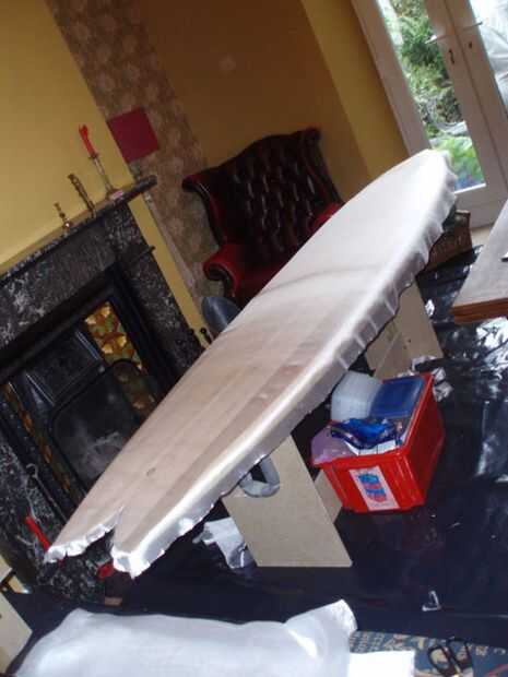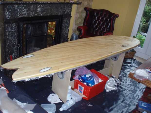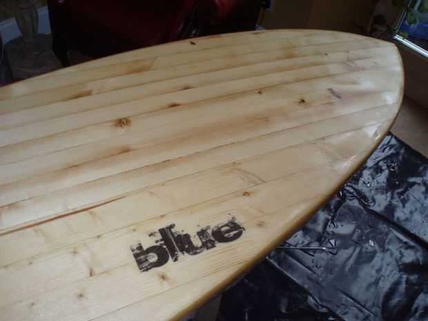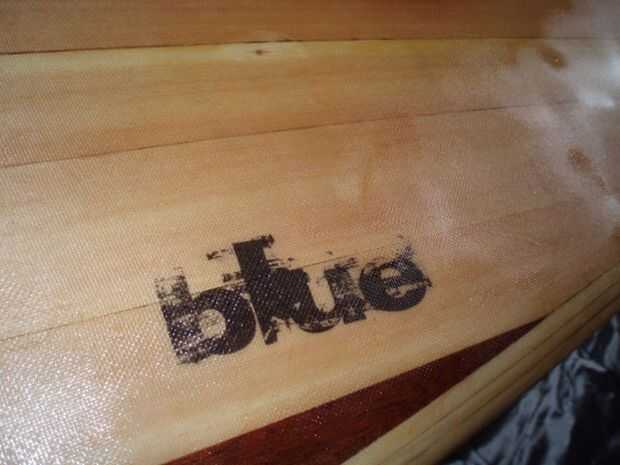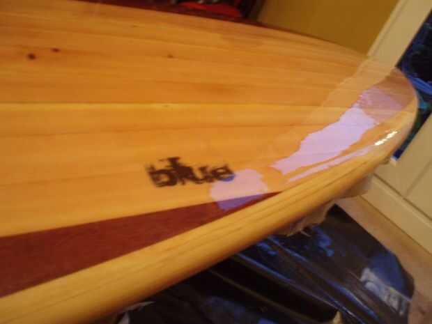 Utilicé una sola capa de fibra de vidrio de 4 oz y resina de epoxy resina investigación. Llena las ranuras de la aleta, correa enchufe y desahogarme con alguna masilla primero. Luego, utilizando un pañuelo de papel y una impresora láser imprime mis logos. Para esto que tuve que pegar el tejido sobre algún papel del portador para que pase a través de la impresora, entonces funcionó a través de dos veces para tener buena profundidad de tóner en el tejido. Puso el vaso sobre la placa y había recortado a tamaño - necesita un par de pulgadas sobre los rieles, y también algo de alivio corta para ayudar al vidrio se ajustan a la fisura de la culata y el perfil de la nariz. A continuación añadir una plataforma de 50mm cinta adhesiva alrededor de la Junta para evitar cualquier goteo manchaba la parte superior. También le ofrece una guía de dónde recortar la fibra de vidrio, después ha gelificado (pero antes puesto completamente). Mezclan la resina squeegeed primero el logos en su lugar, coloca el vidrio sobre y squeegeed en lugar. Una vez que la superficie se ha convertido en "caramelo-como" en otras palabras casi sólido, un cuchillo y recorte el exceso con fibra de vidrio. Repita para la parte superior, asegurándose de que la fibra de vidrio se superpone a lo largo de los rieles. Lustre el tablero con una capa de relleno de resina más y dejar de curar