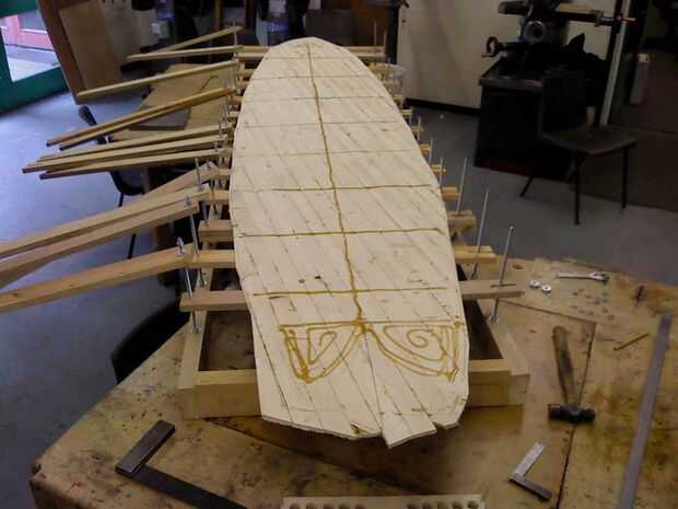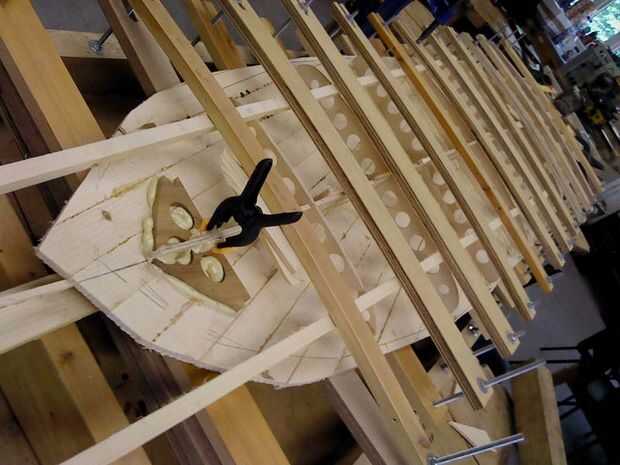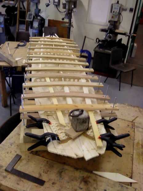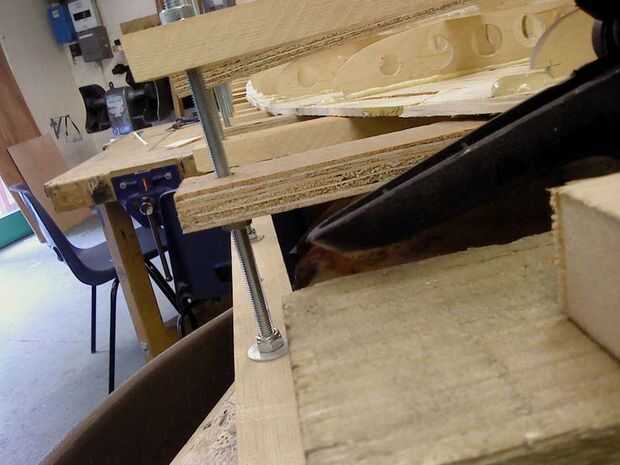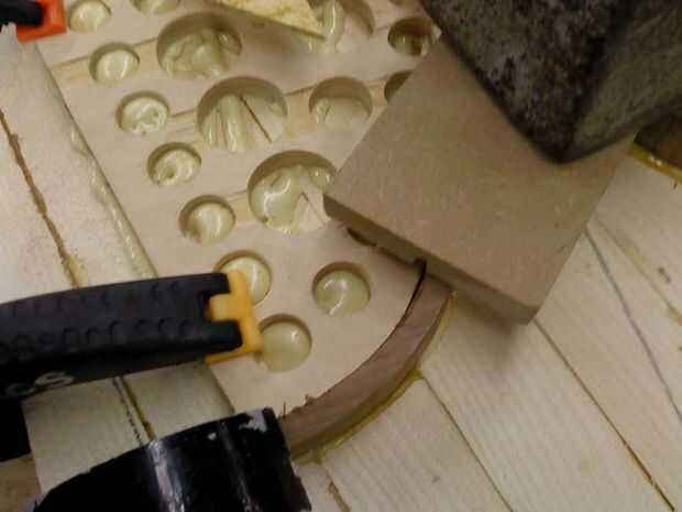 Ya tenía una plantilla de sujeción de un proyecto anterior. Configurar la sección inferior coincida con el eje de balancín de spar, marcar la posición del marco, luego aplicar pegamento. Aquí utilicé pegamento gorila. Luego colocar el armazón y sujete en su lugar. Puedes ver la nariz y cola bloques aquí también. Usé algunos bancos ciencia reciclada para la nariz (teca) y capas para la cola. Tuve suficiente teca a agregar también una franja alrededor de la espina de pescado.