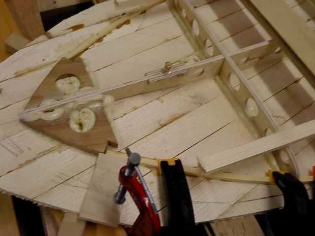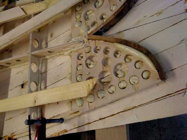 Se puede ver que las muescas en los extremos de cada uno permiten costilla una tira de chine a montarse fácilmente - la primera tira de carril se pegue sobre esto para que la franja de chine determina el perfil del contorno de la Junta. También corte muescas en los bloques para ubicar la tira de chine en nariz y cola. Otra vez, pegamento del gorila es bueno usar aquí como espuma para arriba y rellena los huecos. Es también muy fácil limpiar cualquier exceso con un cincel. Pegamento de la PU de Schenk Dr funciona igual de bien y a veces puede encontrar en ebay por mucho menos de pegamento gorila si el dinero escasea. El pegamento de la PU se cura rápido en un día caluroso también.
