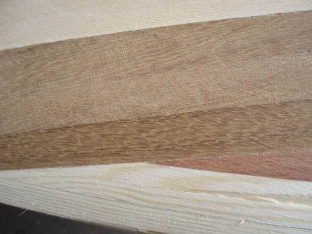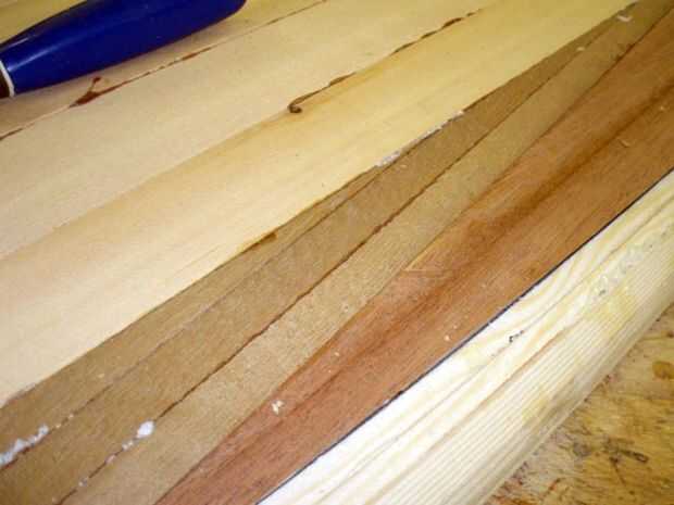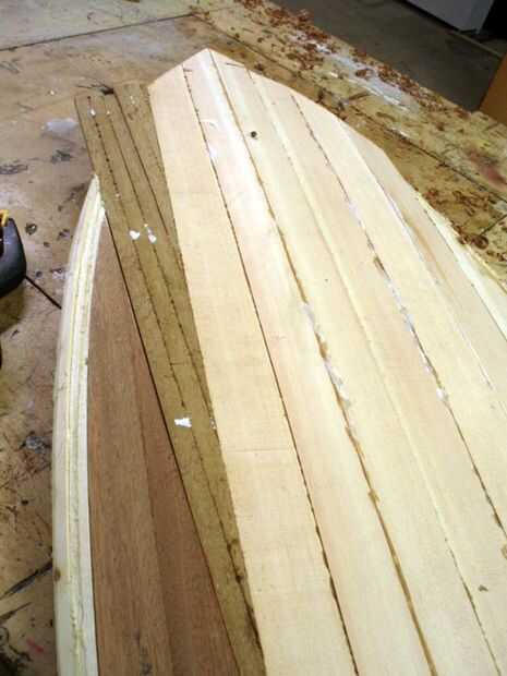 Usar tablones pegados hasta en dos y tres para las cubiertas. Algunas personas les gusta pegar encima de la parte superior todo, luego los rieles para montar la cubierta en la parte superior de una pieza de la pluma. Prefiero a los tablones de la cubierta hasta el borde de las tiras de riel a tope ya que creo que da una mirada mucho más limpia. También significa que se puede colocar fácilmente un agujero en una de las tablas directamente sobre el orificio de ventilación. Los tablones de la diagonal me dieron algunos espacios interesantes a llenar, así que utilicé algunos teca más reclamada y por suerte marcó un pasamanos de caoba también, así que esto fue rasgado para arriba y pegado en. Una vez que había curado el pegamento regaló una arena rápida. Verse bien!