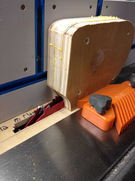 Use este patrón de producción al rastro 9 nueve copias en madera contrachapada de 3/4". Otra vez, utilicé trozos para esto ya que no sería muy visible. Áspero corté las copias en la sierra (Sierra caladora funcionará bien) a dentro 1/8" de la línea de lápiz. Luego pegan el patrón de producción en la copia con cinta doble cara moqueta y tabla encaminan la copia hasta tamaño final, hacer un duplicado exacto del patrón. Luego separa el patrón y repite este paso para las otras ocho copias.