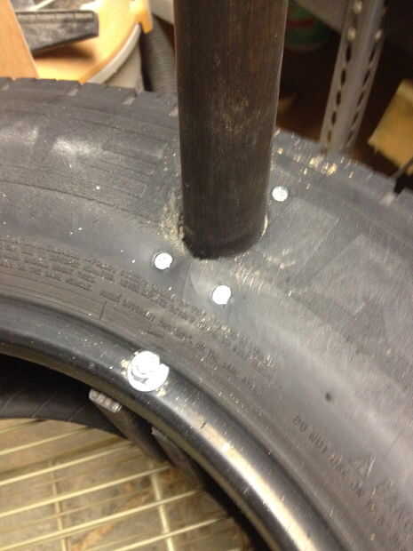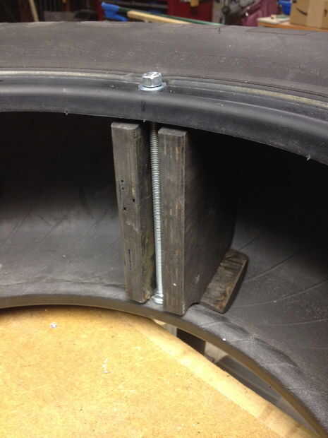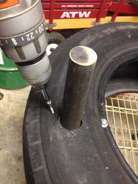 Voltee todo el asunto y taladre un orificio guía a través de la llanta, placa de apoyo superior y en la ayuda de la pierna. Asegurar el neumático, la pierna y apoyar con tornillos de longitud adecuada. No apriete demasiado los tornillos y estropear la llanta. Aunque usé tornillos de cabeza plana, tornillos de cabeza probablemente hubiera sido una mejor opción... Yo no tenía cualquier tiempo suficiente en mano.