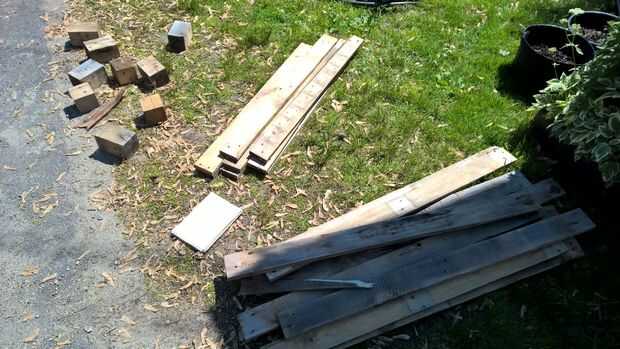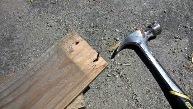Una vez han eliminado las tablas, golpee las puntas de los clavos con el martillo hacia atrás hacia fuera y utiliza la palanca para eliminarlos completamente. Los clavos viejos fueron ir en un recipiente para su eliminación. Los tableros están separados por tamaño en diferentes rumas.