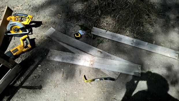 Una vez que esta medida está marcada, pone plataforma reciclada decking en la 2 x 4, les espaciado hacia fuera para que empezar 3/8 a 1/2 de la marca de 2', y que cubren las piernas hasta la parte superior. Fije las tablas con tornillos de 1".