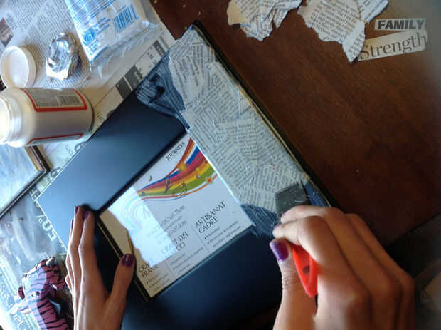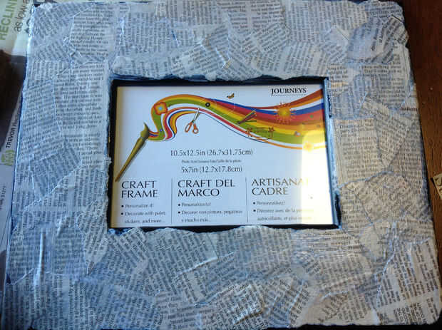Una vez que tengas una buena cantidad de piezas listos, empiezan a superponerse en su marco y cubrir con una capa de Mod Podge.  Continúe esto hasta que el marco entero está cubierto.