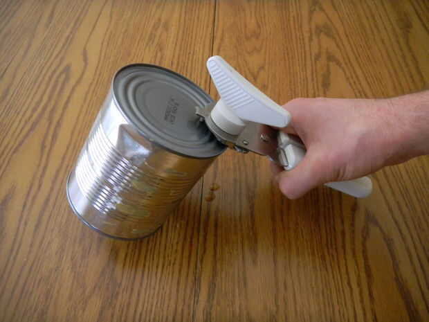 Un pedazo de otra puede fue cortado para caber sobre la brecha en el primer poder. Los agujeros fueron perforados en ambas latas, y remaches se utilizaron para fijarlos juntos.