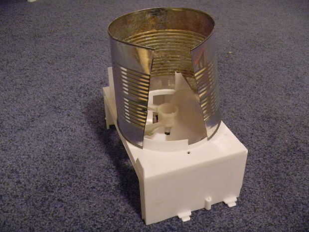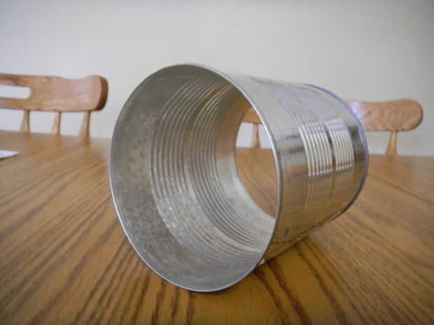 A continuación, los esquileos del metal fueron utilizados para cortar el borde de la lata, por lo que se puede estirar hacia fuera. Esto se hizo al incease el diámetro de la lata, para adaptarse mejor al ventilador.