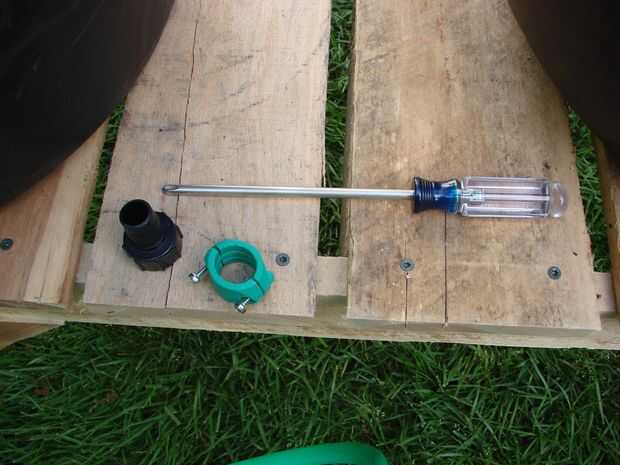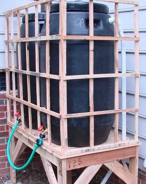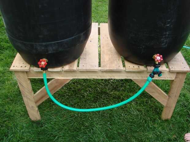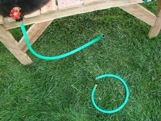 Colocar los barriles de lluvia en el stand. Coloque el líder de la manguera en el barril del lado izquierdo. Este es el cañón de entrada del canal. Mida la distancia hasta el cañón de la derecha y cortar la manguera. Cerca de 4 pies debe estar bien – no cortar la manguera demasiado corta o estará haciendo otro viaje a la ferretería!
