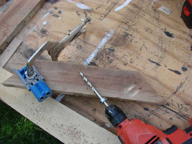 Empezar la construcción del marco haciendo los lados largos que consisten en 2 patas y una viga horizontal. Anexe las patas a la viga con 1-1/4" tornillos Kreg pocket hole. Hacer 3 agujeros de ocultación en cada viga. Use pegamento para madera resistente al agua para hacer un robusto conjunto. Esta junta llevará algunos poundage grave (160 libras a lo peor - los puntales transmitirá parte de la carga a las extremidades inferiores - no soy un ingeniero mecánico por lo que no puede decirle cuánto!) por lo que debe ser bien hecho.