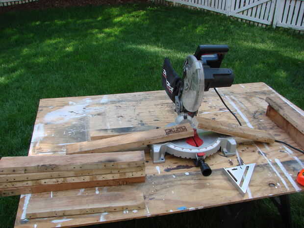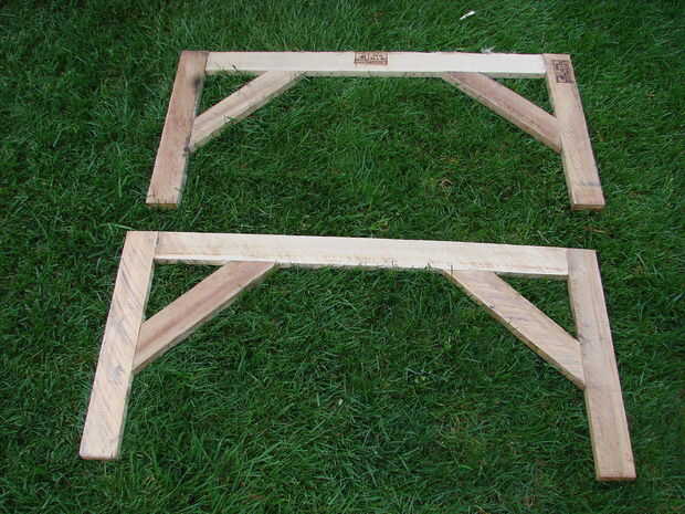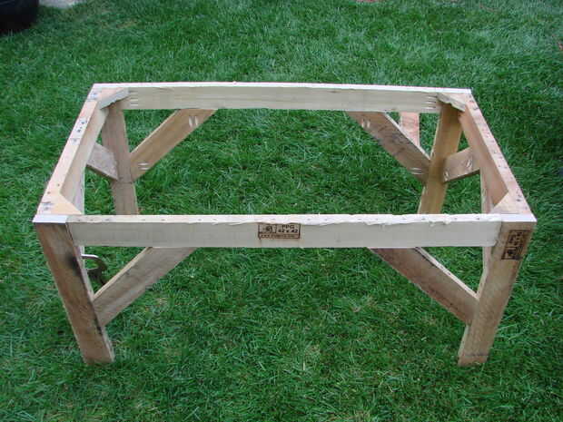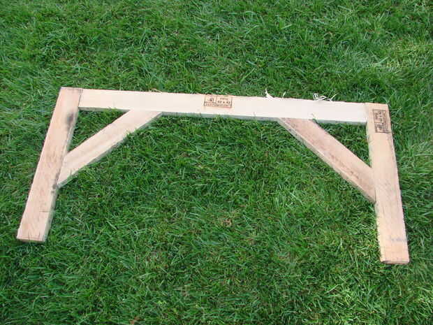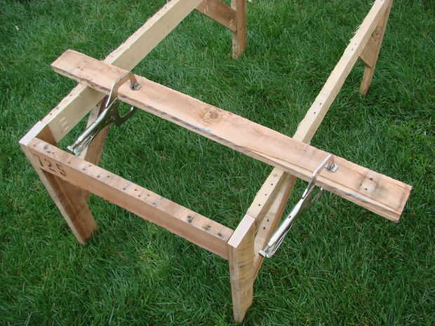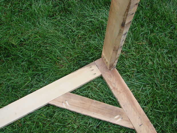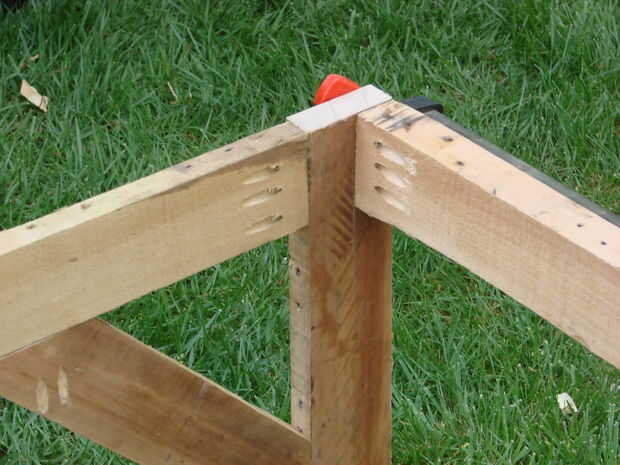 Ahora añadir las barras que le ayudará a transmitir algo de la carga en la viga horizontal hasta la parte inferior de la pierna. También estabilizar el marco y evitar que las piernas de colapso de cargas laterales. Use pegamento y tornillos de agujero 1-1/4" hilo de rosca fino bolsillo para los puntales. La madera no es perfecta, que tal vez necesite ajustar el ángulo de inglete un poco para obtener los soportes de ángulo plano contra la viga horizontal y la pierna. Esta es una de las características de trabajar con madera de palets - hace pequeños ajustes a medida que avanza.