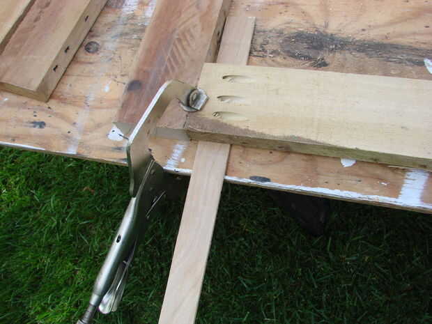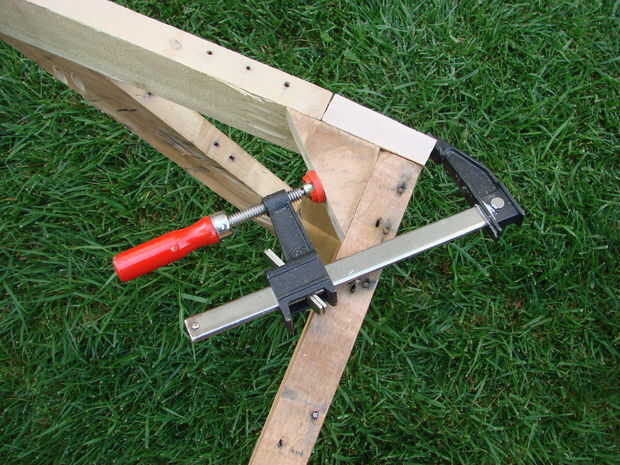 Los cortes de los soportes de ángulo se usaron para estabilizar la estructura de una torsión. Las piezas triangulares Haz un agujero de ocultación en cada dirección tal como se muestra en las fotos, después de lo cual consigue pegados y atornillados en cada esquina. La abrazadera es útil para mantener a éstos en lugar mientras que atornillarlas. Los refuerzos (creo que es el término adecuado para estas piezas triangulares en la terminología de encuadre) ayudan a detener el marco de una torsión. Apoyo adicional vendrá de la cubierta superior pero llegaremos a eso más adelante.
