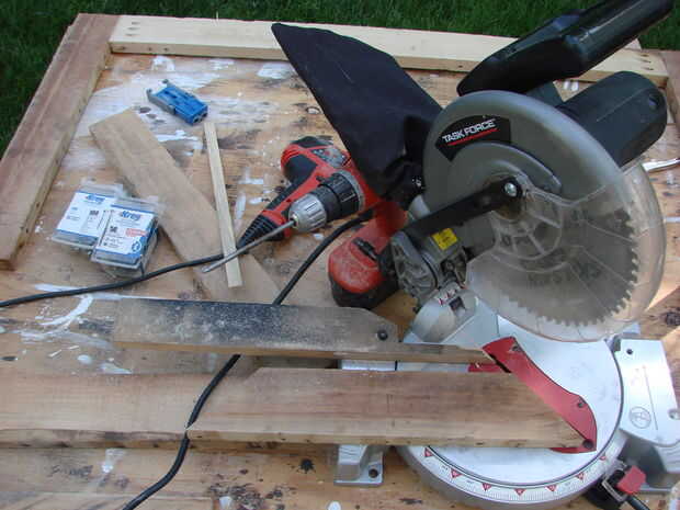 Debido al problema con clavos incrustados en uno de los palets con volver a cubierta, era incapaz de hacer cortes de inglete para los soportes de ángulo en las vigas con clavos incrustados. Esto significaba que era de madera... hasta que me di cuenta que tenía bastante cubiertas planchas para los soportes de ángulo. Los tablones de la plataforma son sólo 1/2" de espesor por lo que dos laminados juntos con tornillos y pegamento de madera. No necesita hacerlo si selecciona sus plataformas para evitar unas con clavos incrustados.