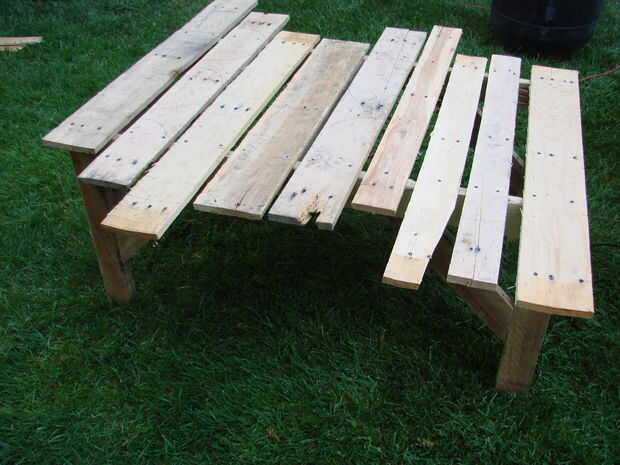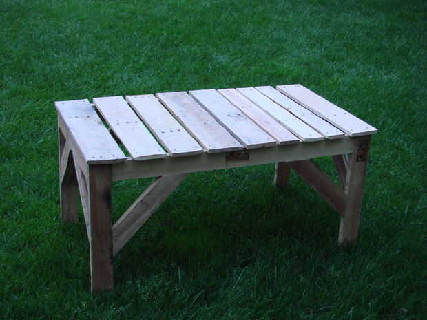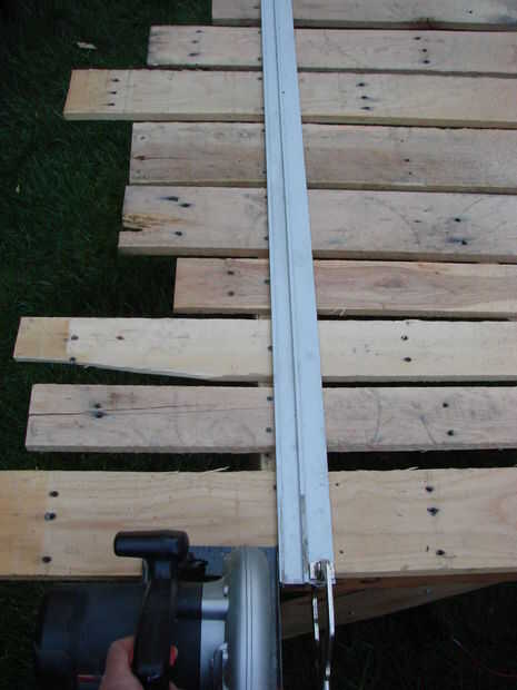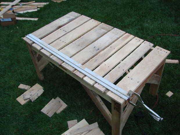 Los tablones de la plataforma recuperados de las paletas se utiliza para hacer la cubierta superior del soporte del cañón. Los extremos de las tablas suelen estar en peor condición. Simplemente coloque los tablones sobre el marco para que las mejores partes son entre las vigas de largo. El plan es para que la cubierta se superponen el marco por unos ½" en cada lado. Deja sobre un ¼" a ½" diferencia entre tablones para permitir el drenaje. Los vacíos en mi stand ven un poco grandes y deseo que les había hecho más estrecha.