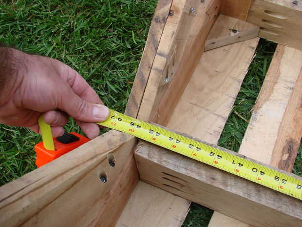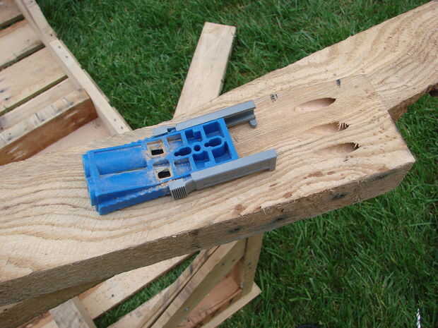 Luego medir la longitud de las piezas de estabilizador 2 lateral indicado en la imagen superior y tornillo y péguelas en su lugar con 1 -1/4 "tornillos de agujero del bolsillo. Finalmente, colocar una viga larga diagonalmente a través de dos de las patas y medir la altura de la pata del centro. Cortar a este pata y luego pegue y atornille en su lugar utilizando el largo 2-1/2" Kreg pocket tornillos de agujero.
