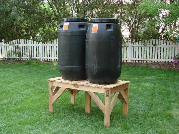 Incluso después de un peso de 500 libras éxito prueba sin un solo crujido o gemir (toda la familia de 4 pie sobre la tabla y moverse - una buena 40% del peso es mío!), me preocupaba un poco que en aproximadamente 800 libras de carga (2 x 50 galones de agua), la tabla no sería capaz de soportar los barriles de lluvia. Diversas fuentes web tienen un solo pino amarillo 8 pies 2 x 4 capaces de soportar hasta 600 libras de resistencia a la compresión de la carga. Todo lo que sé sobre la madera de la plataforma es que es más duro y más denso que pino debería ser capaz de llevar más carga, pero tiene una sección transversal más pequeña que un 2 x 4 (1 1/8 "x 3" versus 1 ½ "x 3 ½"). En aproximadamente 200 libras por trayecto y suponiendo una carga uniformemente distribuida y haciendo caso omiso de la transferencia de carga hacia abajo de las costillas para una peor, el diseño en este punto debe fácilmente llevar la carga de 800 libras.