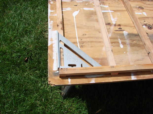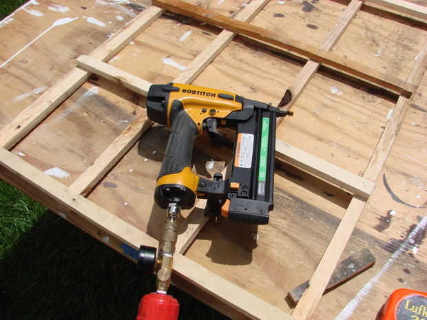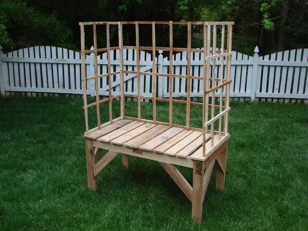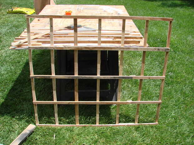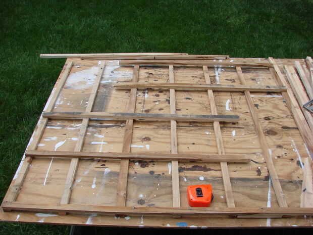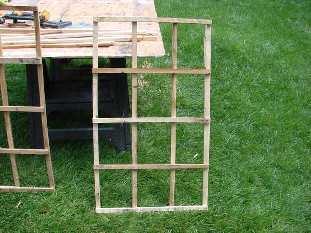 La rejilla se hace colocando las piezas en una gran mesa. El espacio de centro entre las piezas vertical elaborado a cerca de 9-1/2". Algunas distancias son un poco más, algunos un poco menos – ajuste a medida que avanza. No todas las piezas son exactamente 1" de ancho, así que tenlo en cuenta. Hice un lay-out seco y luego moviéndolo de izquierda a derecha, pegados y clavados a todo en su lugar. Donde la madera no es suficiente, cortar un 3" unirse a la pieza de madera y pegamento y clavo a la parte posterior para unir 2 trozos para darle la longitud deseada. Se trata de construcción de forma gratuita para divertirse con él.