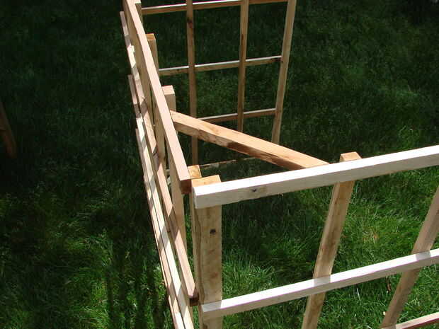 Los enrejados se unen entre sí con clavos y pegamento. He añadido refuerzos en las esquinas para la estabilidad adicional como se muestra en las fotos. Estos eran clavados y pegados en lugar.