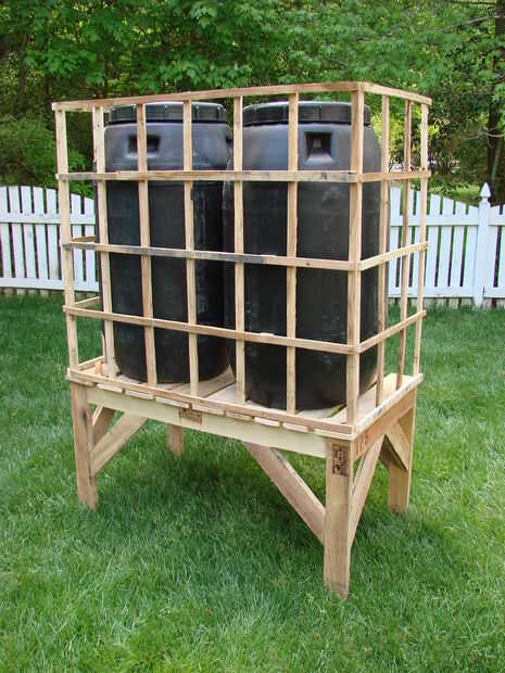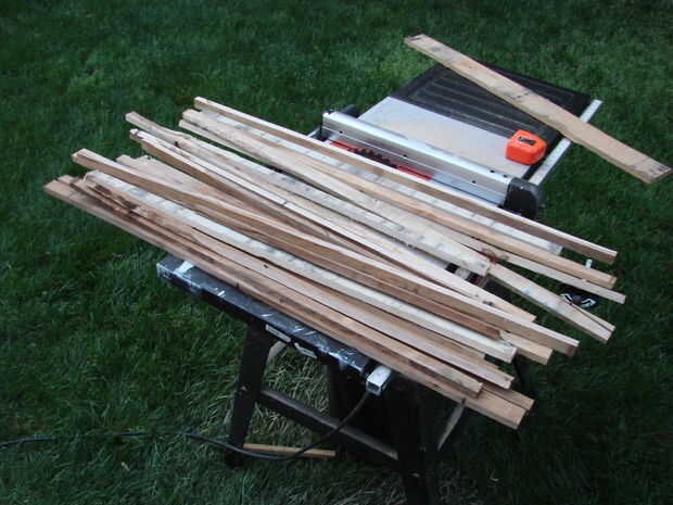 Rasgar las restantes tablas de cubierta a tiras de 1" de ancho con una sierra de mesa. Estas tiras son clavadas y pegadas juntos para hacer una estructura de enrejado. Usted necesitará hacer un enrejado delantero y 2 laterales enrejados. La rejilla delantera es aproximadamente 48" largo por 36" de alto. Esto proporciona una buena cobertura de los barriles de lluvia. Para los lados, la rejilla es 20" profundo por 36" de alto.