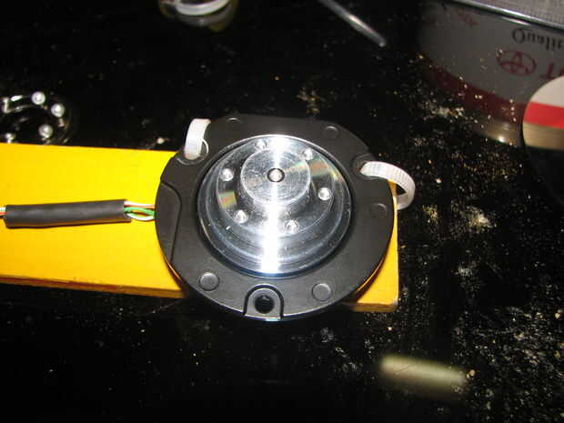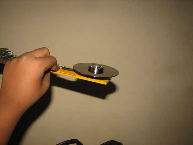 Después de que el motor está acoplado a la base, podemos colocar el plato para el motor. Recuerde usar al espaciador que guardó lejos en el paso 2 y coloque todos los tornillos para evitar daños cuando el motor gira hacia arriba.