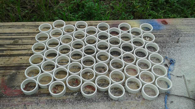 Quería crear un entramado de anillos de PVC, así que tuve que cortar. Cortar los anillos de 3/4" utilizando el borde del plástico amarillo en mi cama de sierra como guía. Presenta los anillos cuando fui para determinar las dimensiones de la alfombra. Terminé de filo 60 cortante por una estera de 6 x 10. Limpiar los anillos con una navaja para quitar cualquier exceso de plástico.