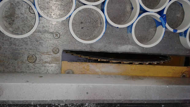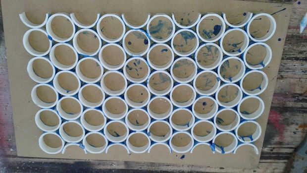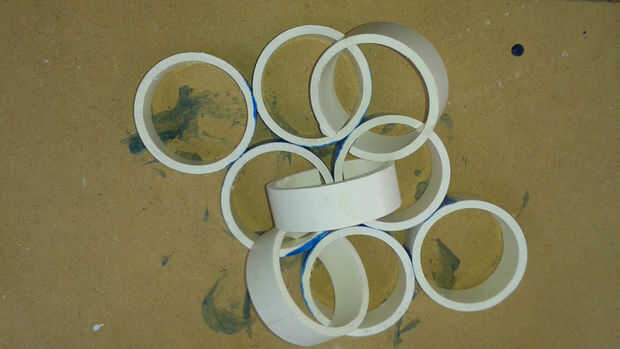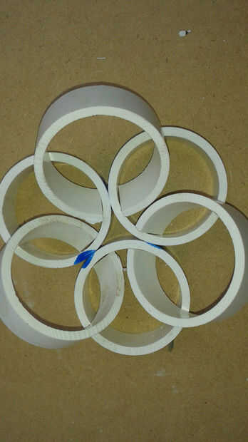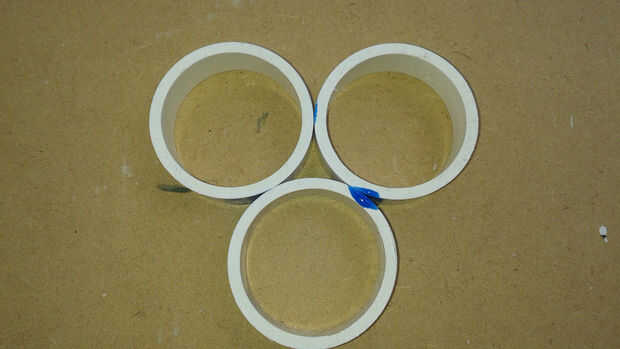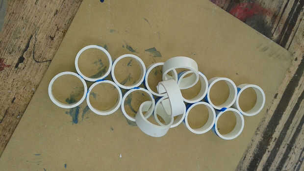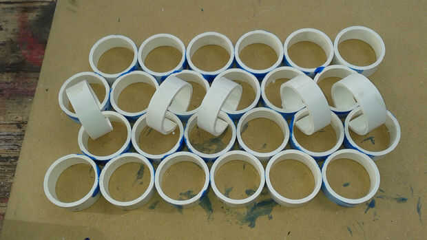 Empecé primero de cementación los anillos en secciones de tres anillos. Entonces conectadas las secciones, construcción de la malla final. Usé cemento PVC y dividir PVC abrazaderas de anillo para mantenerla firme mientras cura. Cuando el tapete se curó usé la Sierra de mesa para eliminar las piezas salientes de anillo para hacer un bonito Tapete rectangular.