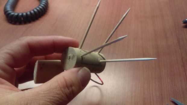 11) introducir un palillo de dientes individual en cada uno de los agujeros. Asegúrese de que aplique un poco de pegamento en la punta de los palillos antes de colocarlos en los agujeros.