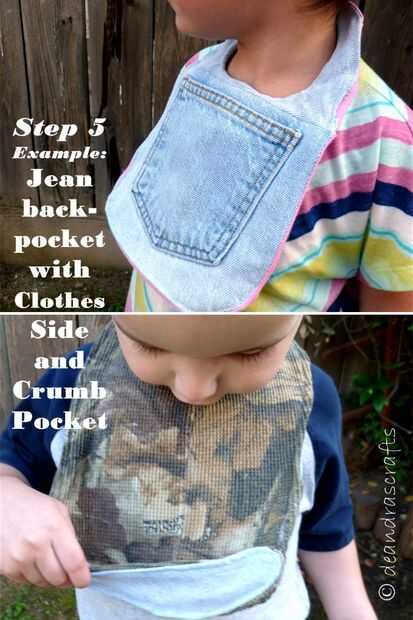 (Paso 5) Bolsillo de los pantalones vaqueros de nuevo en un lado impreso ropa en el otro con una bolsa de migas (dos baberos hechos)