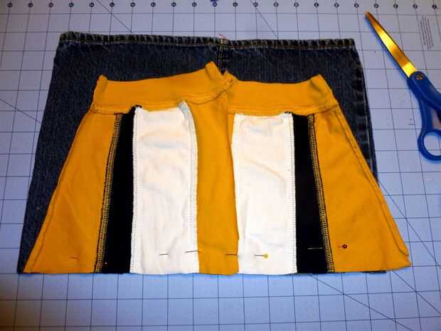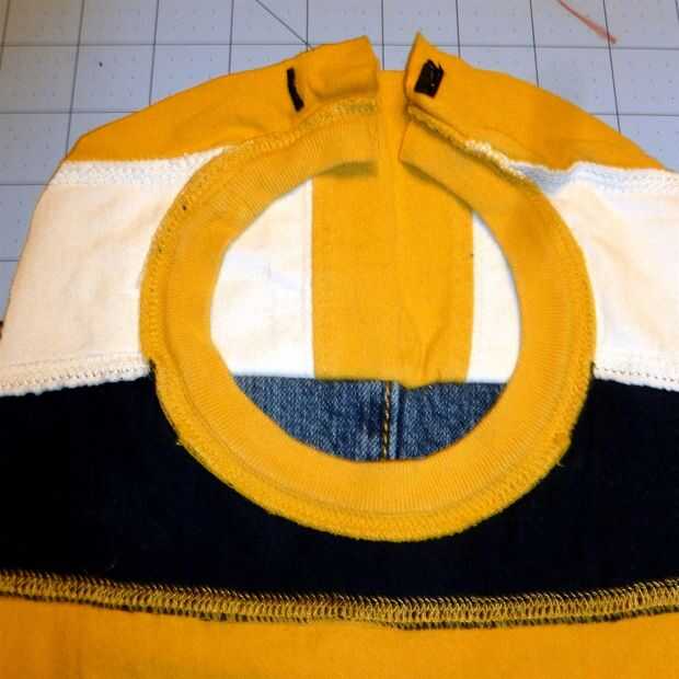 Con los derechos cubrió juntos, cosí el material de manga a la parte superior del material de jean.