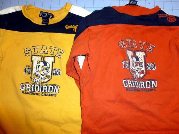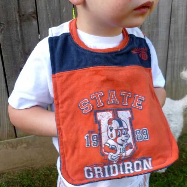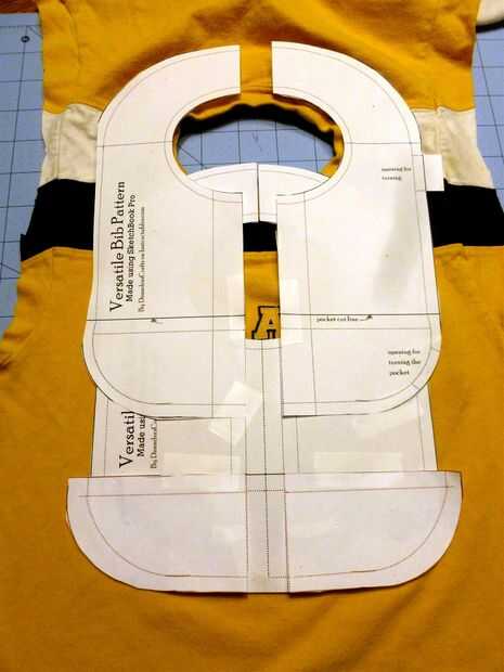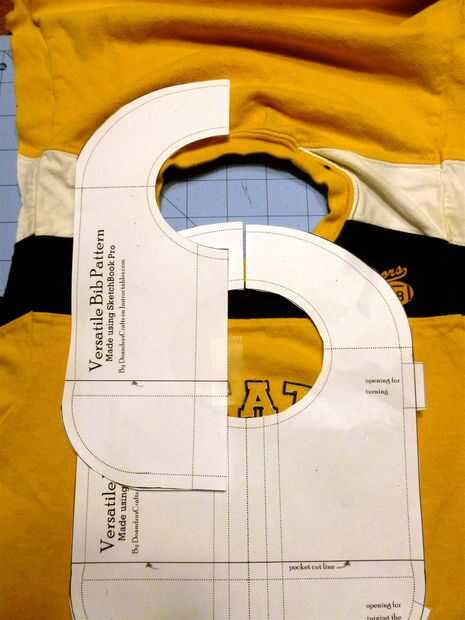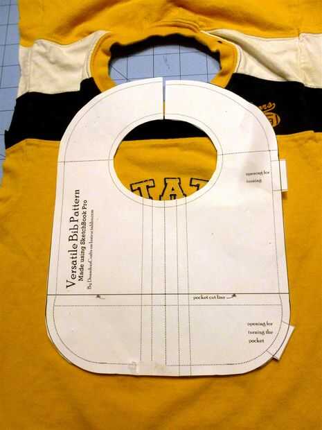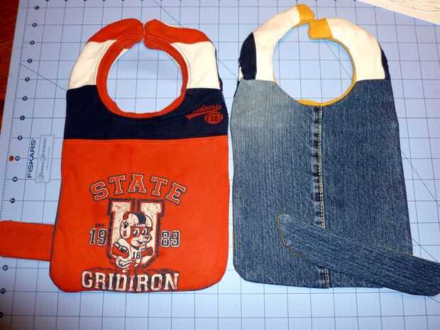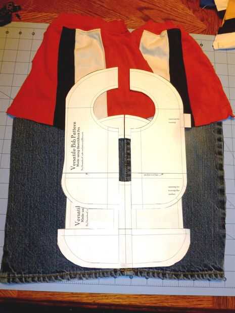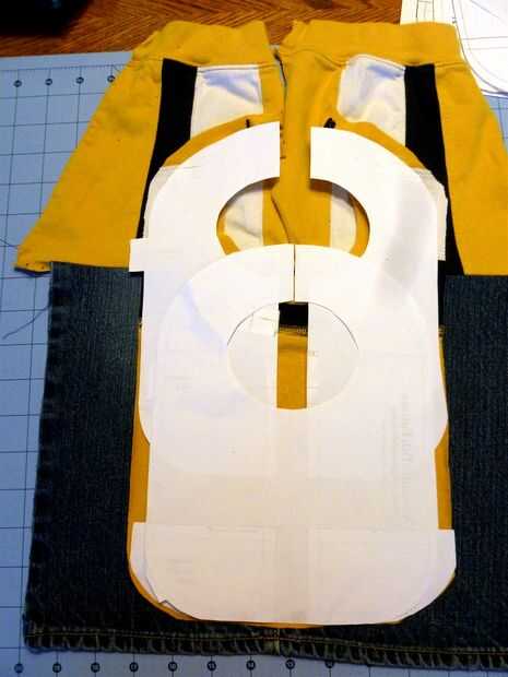Como con la mayoría de los baberos he creado hasta el momento, utilicé algunas hojas del patrón para cubrir el entero logo frontal de las camisetas y había hecho el ajuste material de jean en la parte posterior.