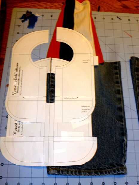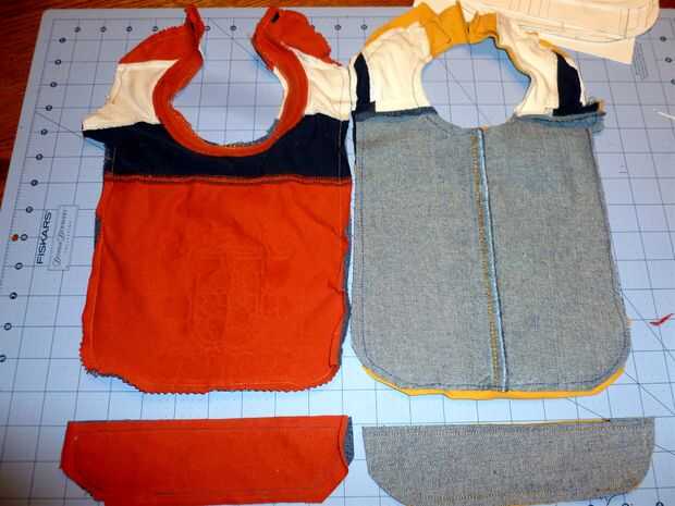 Tomé una foto borrosa (y se lo incluyo, de todas formas creo que es importante que mi proceso de pensamiento) del patrón de babero en los pantalones vaqueros y la parte superior de la espalda del babero. Porque el resto material de jean no era tan largo como el patrón, improvisé la parte superior de la parte trasera del babero con las mangas de la camisa. Los múltiples colores del material en las mangas hechas por un gran patrón, pero definitivamente no eran fáciles de coser a través de.