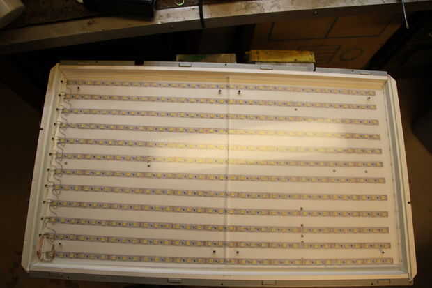 Ahora necesita garantizar la estancia de tiras de LED con la espalda pegajosa en el plástico. SE caen, si no instalas la hoja del policarbonato por encima de ellos. Través de pequeños agujeros de taladro las hojas de policarbonato y el metal base. Fije la hoja de montaje con remaches de metal.