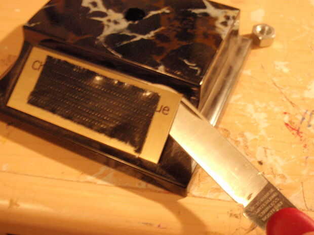 a continuación, quite la placa metálica que está grabada con tu nombre y equipo. Esto puede hacerse fácilmente con un cuchillo.
