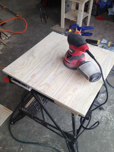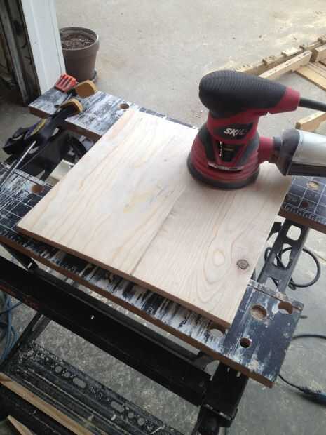 Ahora toma la lijadora excentrica con papel 120grit y sólo la parte superior de la plataforma y parte superior de la arena. También un ligero chaflán en todos los bordes de la parte superior y el estante de la arena.