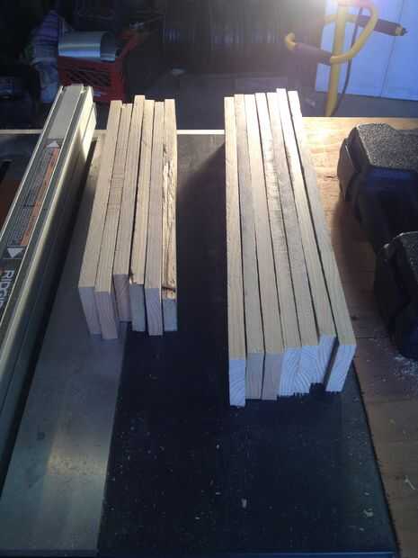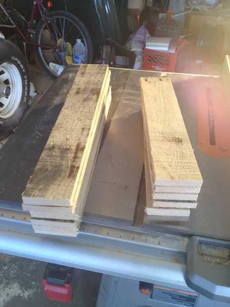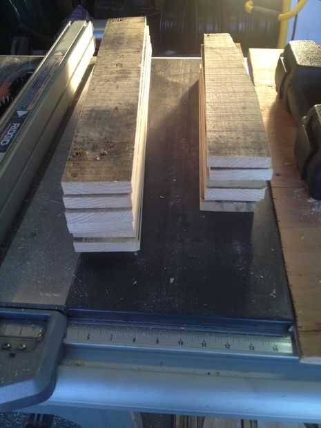 Dependiendo de la longitud y anchura de las tablas de palet puede tomar diferentes cantidades de tablas. mina eran 3.5" de ancho por alrededor de 38" de largo. Para cortar una sección de 21" y una sección de 15" de cada tablero con un chop vio, si las tablas son más largas podría conseguir las 21" 2 secciones o 3 secciones de 15". Esto utilizará 7 tableros, por lo que tiene 7 de cada longitud.