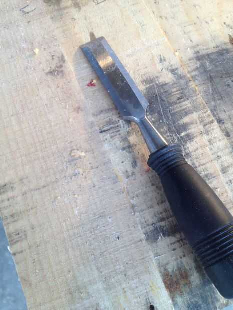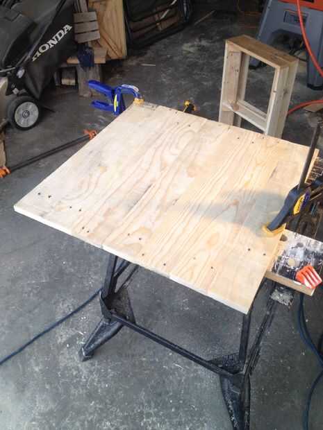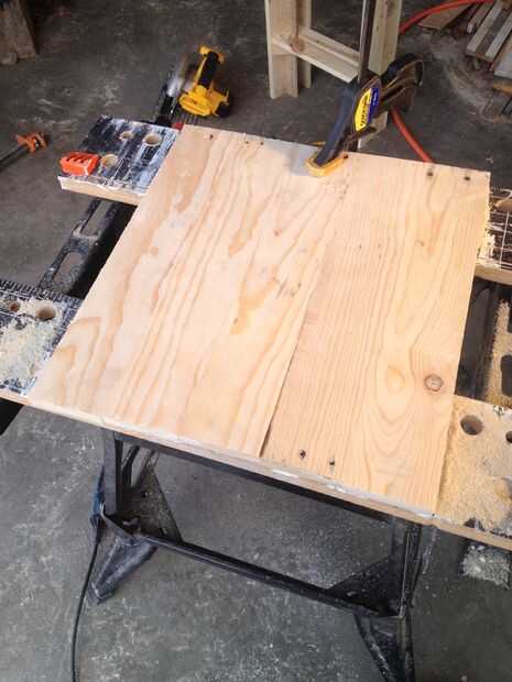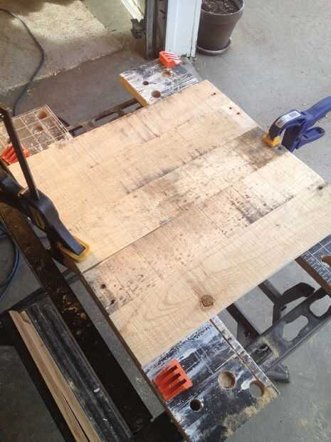 Empezar por la sujeción de la parte superior o estante para un banco de trabajo y usando un cincel para quitar el pegamento seco globs de ambos lados.