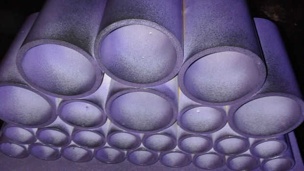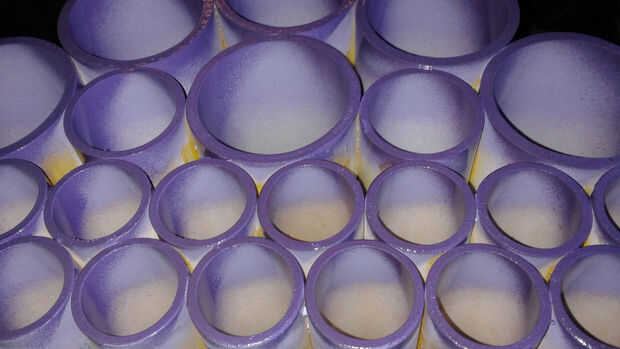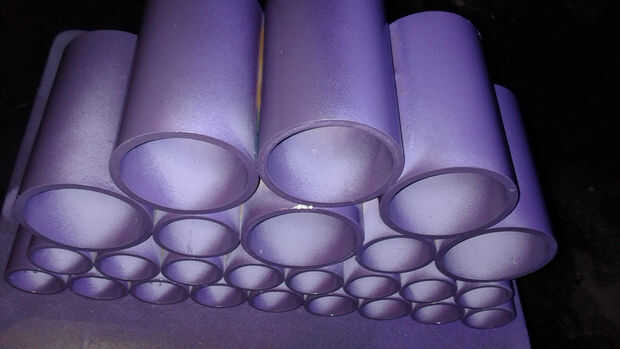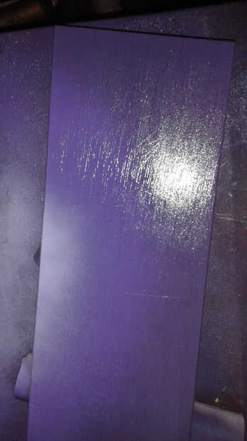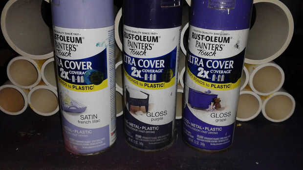 Yo utiliza tres tonos de pintura en aerosol Rustoleum púrpura para acabar el organizador de cable. Pintó la plataforma en forma de sunburst se desvaneció y pintado la parte inferior sólida de color púrpura oscuro. Pinté el PVC con color púrpura oscuro en un ángulo desde la izquierda. Pinté el medio púrpura de la derecha. Pintó con el luz violeta por detrás a través de cada tubo. Roció la parte delantera de la plataforma con el negro de la parte superior muy ligeramente. Este trabajo de pintura da el estante una perspectiva y profundidad de sentido más profundo.