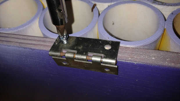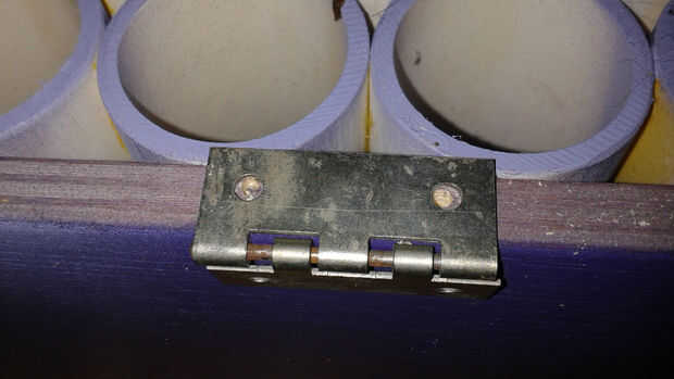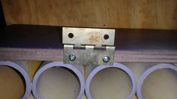 Os adjunto el estante para el PVC con tornillos. He añadido algunas bisagras recicladas de un viejo órgano para colgar el estante de.