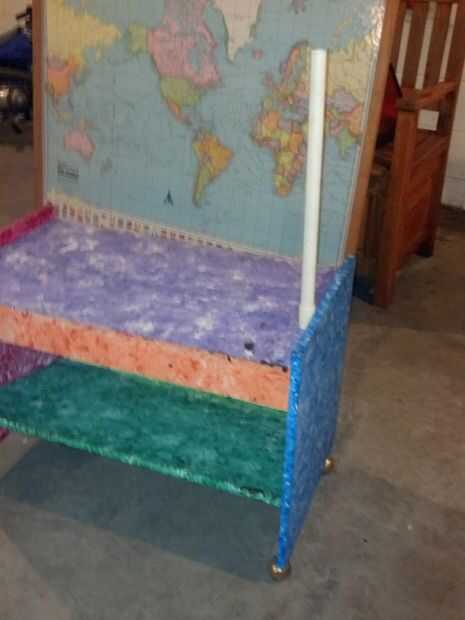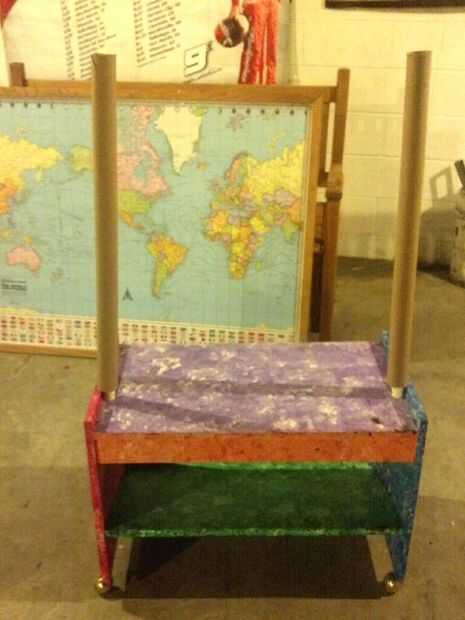 Para la base de teatro estoy reutilizando y viejo carro de la TV de cuando era un adolescente y ha sido colgado en mi ático desde la época de Clinton. Ya fue pintado así y grande para este proyecto ya que es en las ruedas. El estante inferior para guardar los títeres. Para comenzar a tomar tus 2 tornillos y 2 enganches de pvc. los acopladores a cada lado del tornillo con un taladro. Luego necesitas 2 tubo de pvc de 12 pulgadas... Fije cada tubo a un acoplador. Lo hice de esta manera por lo que se puede cambiar el escenario del teatro. Ahora usted tendrá que cortar 2 pedazos de la tela cartón de tubo de 28 pulgadas. una vez cortadas, colocarlas sobre el tubo de pvc para asegurarse de que son. Ahora estamos listos para hacer el frente del teatro...