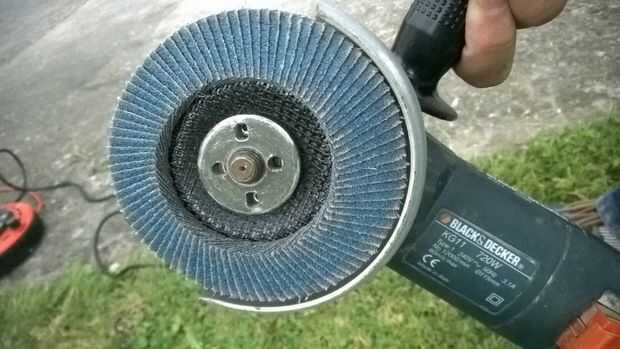 Como helms la mayoría que están disponibles y no a caro suelen ser bastante sucios y oxidados el primer trabajo es limpiar el timón. Primero mediante una afiladora de pescador con un disco similar al que se muestra en las fotos quitar todo el moho de las bandas de metal en el borde de la caña esto debe dejar la mirada brillante de metal.