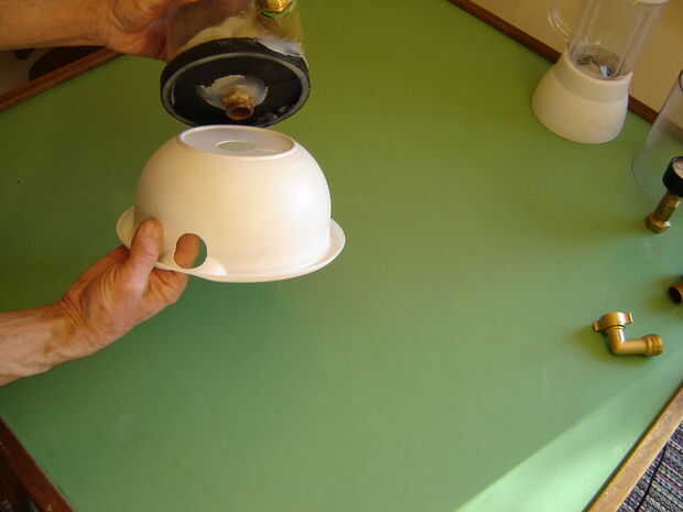 La batidora se encuentra en un recipiente que ha cortado para las mangueras. Hay un montaje bajo la turbina de 90 grados.