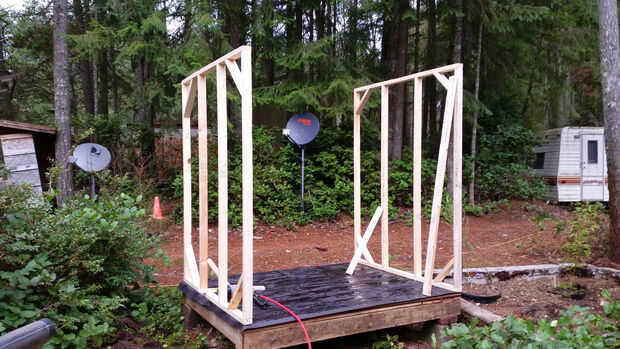 En este punto se volvió locos y compró una carga de 2 x 3 y unos 2 x 4 al marco de las paredes. son de 2 x 3 mucho estructuralmente sonido para edificio galpón paredes en nuestro clima y ofrecen la ventaja de dar unas cuantas pulgadas más de espacio interior y son generalmente más barato que 2 x 4. Desde nuestra vertiente es más corta que las tarjetas estándar de 8' utilizamos las piezas extras cortadas a 45 grados para reforzar las esquinas. Normalmente esto sería estructuralmente necesario ya que la madera exterior da estabilidad lateral. Pero ya que estábamos usando madera reciclado tamaño muy aleatorio pensaba que esto ayudaría a añadir estabilidad.