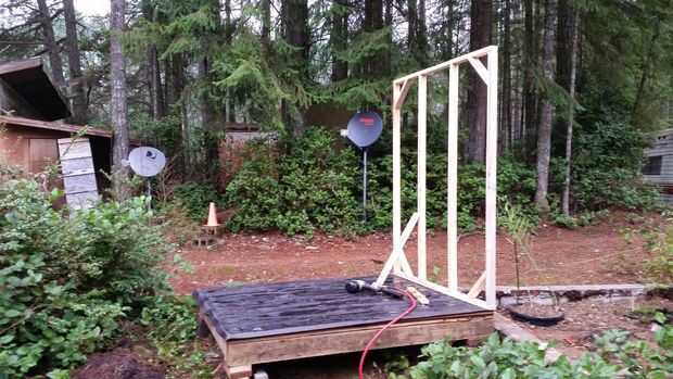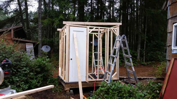 Encontramos una puerta en un centro de reciclaje y enmarcado que en este momento desde la puerta aberturas suelen ser difíciles de trabajar con y una ligera inclinación a nuestro techo por arrojar agua. Nuestro clima es suave y nieve es rara, por lo que sería probablemente más de una inclinación en otros climas. Nosotros también habían inclinado nuestro al sur ya que sería más adelante agregando una instalación solar.